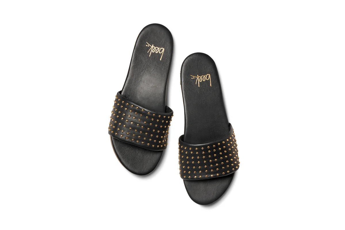 Shop BLINGBIRD leather slide sandals in our beach and black colors.