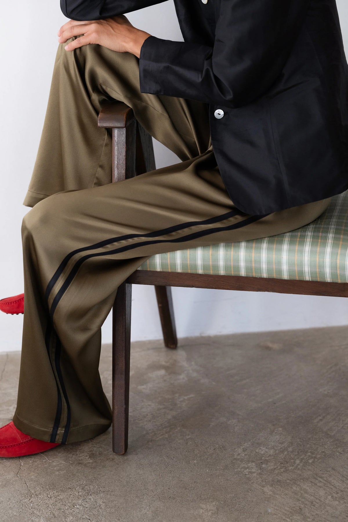 The Silk Stripe Simple Pant is crafted from our luxe 100% silk charmeuse. Designed with an elastic waistband, full-length fit, and a clean, straight-leg silhouette, finished with contrast racer stripes.