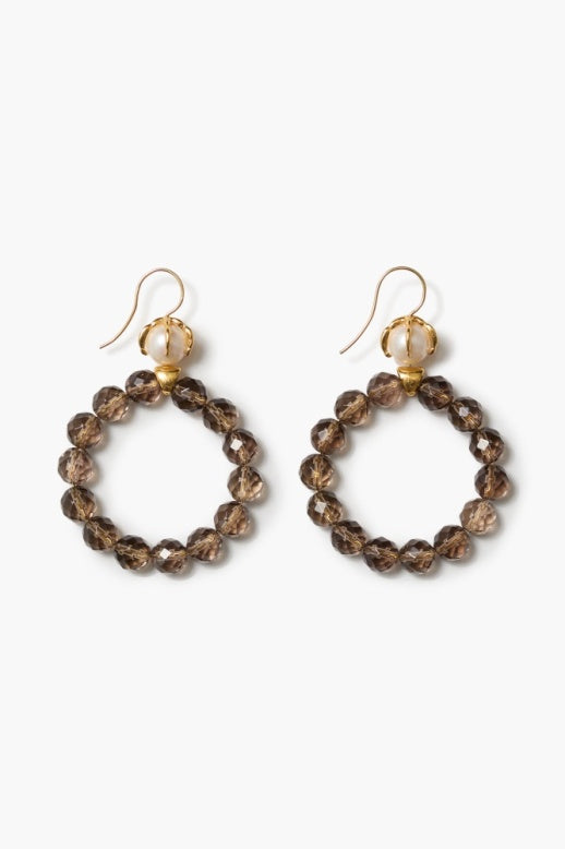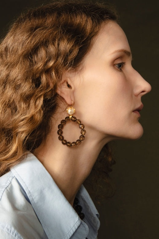 Gold plated brass hoop earrings featuring smokey quartz and talon held freshwater pearl on sterling French hooks. 1 3/4in. drop, 1 1/4in. hoop diameter.