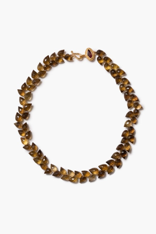 18k gold plated sterling silver necklace featuring whiskey quartz and bezel wrapped garnet hook closure. 17in length.