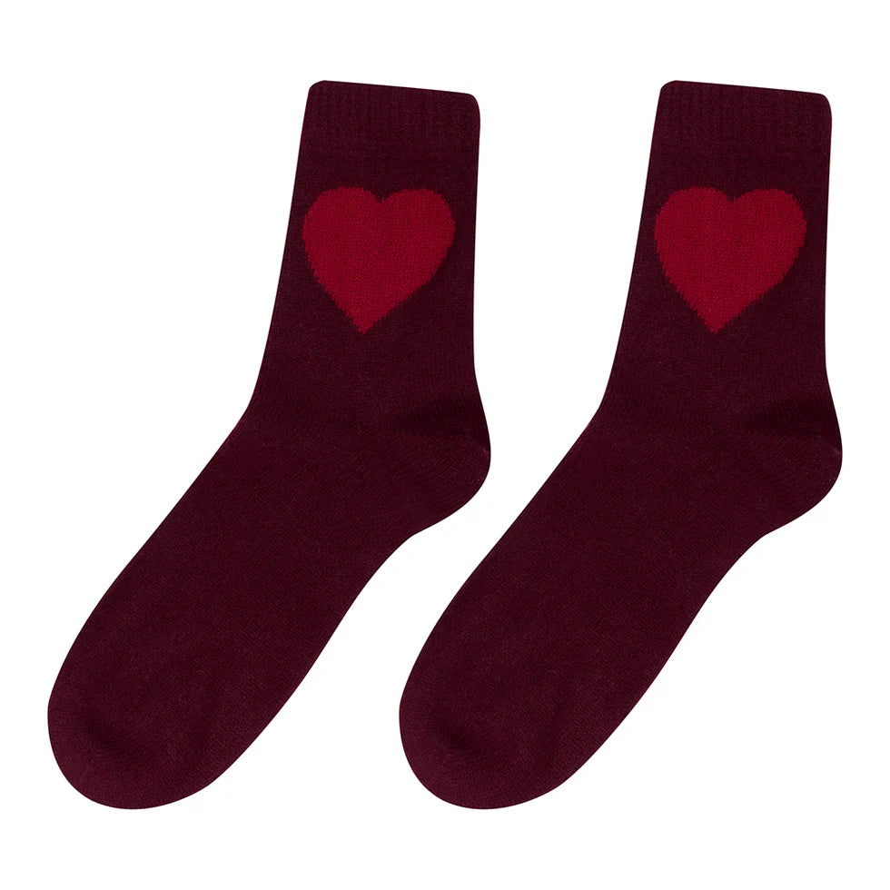 Jumper 1234 cashmere socks. Burgundy 'bed' socks with dark red intarsia hearts. Softest socks in the world but don't wear them with your shoes! One size and 8 other fabulous colour ways available. Wear your heart on your socks!!!
