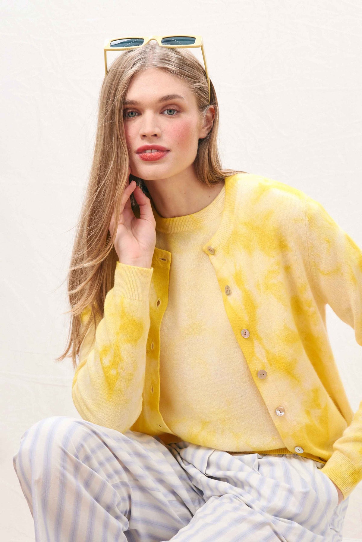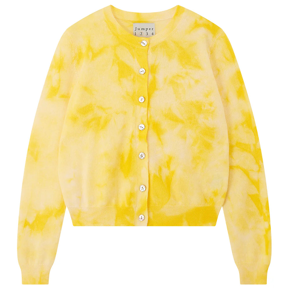 Jumper 1234 cashmere cardigan. Tie dye crew neck cashmere cardigan in turquoise and pale blue. There's a matching short sleeve jumper too and a choice of 3 colours. It's true to size and we're obsessed!