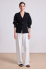 V neckline, hourglass silhouette, front button placket, dropped armhole with slight balloon sleeves, rib finishings