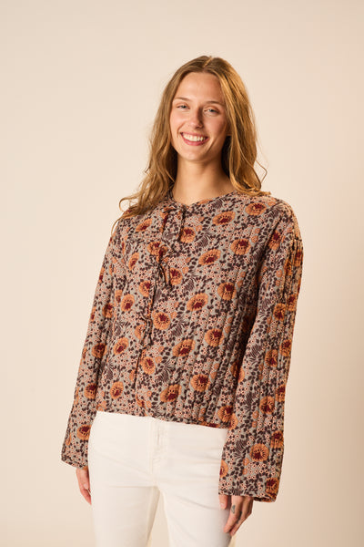 Thinly quilted jacket with three front ties, a round neckline, and slightly oversized sleeves.